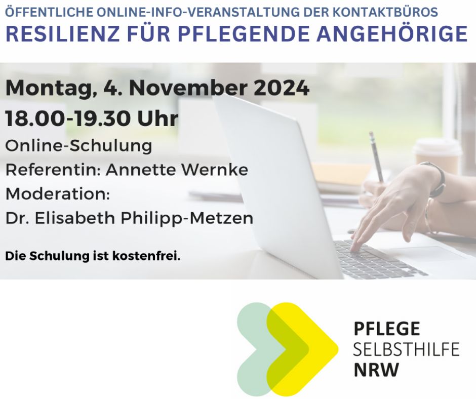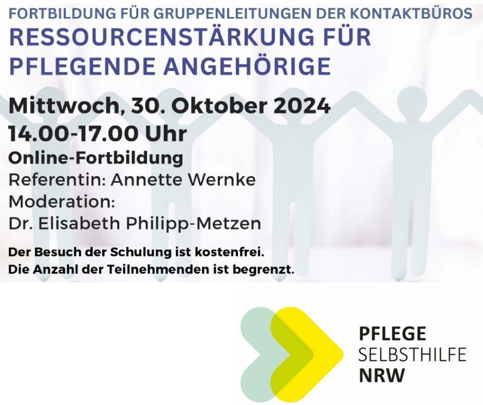 Im Zentrum dieser Fortbildung stehen Ressourcen, Empowerment und Unterstützung beim Aufbau von Resilienz für pflegende An- und Zugehörige durch die Gruppenleitungen. Weitere Informationen entnehmen Sie bitte diesem Flyer.